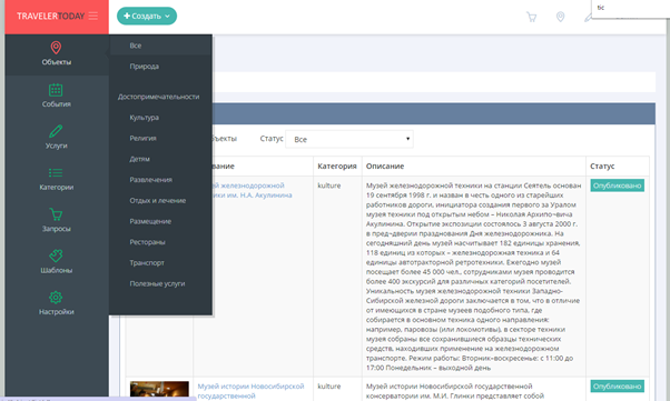 Объекты – это основной элемент в системе, который позволяет отображать всю информации о туристических объектах в приложении. Объекты группируются по категориям и имеют Услуги. Любые созданные объекты после публикации отображаются в приложении, могут обновляться или архивироваться.