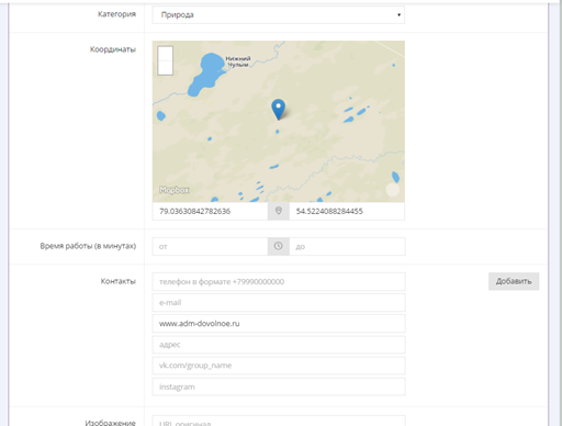 Все контакты указываются в формате, описанном в соответствующих полях. Есть возможность добавления дополнительных контактов по кнопке «Добавить» справа.