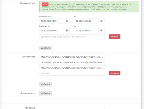 Время действия позволяет указать время отображения услуги в мобильном приложении и добавить время события, (см. подсказку рядом с полем), а также добавить услуги в «Афишу» кнопкой «Promo ON». Настроек времени отображения может быть любое количество, например, для создания разных тарифов на услуги в разное время года или определенные дни. Поле «Цена» в настройки времени заменяет стандартное значение на время действия услуги.