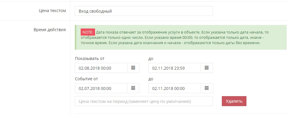 Пример 2: ваше событие идет несколько дней с 20.02. до 24.02. В "показывать от" ставьте дату с текущего дня (к примеру сегодня 13.02) до завершения мероприятия (24.02). В "событие от" указывайте конкретный период, когда стартует и завершается событие. Итог: афиша будет отображаться с 13.02-24.02 с подписью дат "20.02.18 - 24.02"