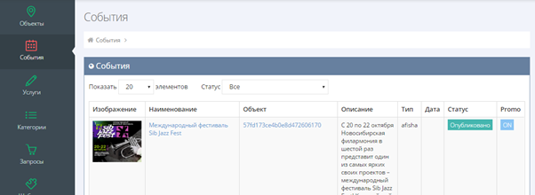 Все созданные настойки времени действия услуг отображаются в меню «События», где указана даты, ссылки на услуги. Это позволяет легко отследить какие объекты в данный момент действуют и отображаются в «Афише» в приложении в порядке убывания.