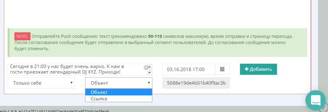 Шаг 1. Для создания push-уведомления зайдите в личный кабинет, далее ‒ в ваш объект (кафе, гостиницу, бар и т.п.) или услугу (акцию, афишу и т.п.). В самом низу экрана вы увидите поле для создания и рассылки «пушей».
