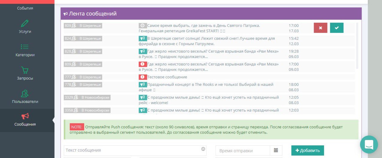 Далее рассмотрим, как согласовывать уведомления, которые отправляют на модерацию менеджеры объектов. Для вашего удобства в левом меню есть раздел "Сообщения", в котором отображаются все push-уведомления и их статусы. Вы можете согласовать сообщение, нажав на зеленую кнопку с галочкой или отклонить, соответственно нажав на красную.