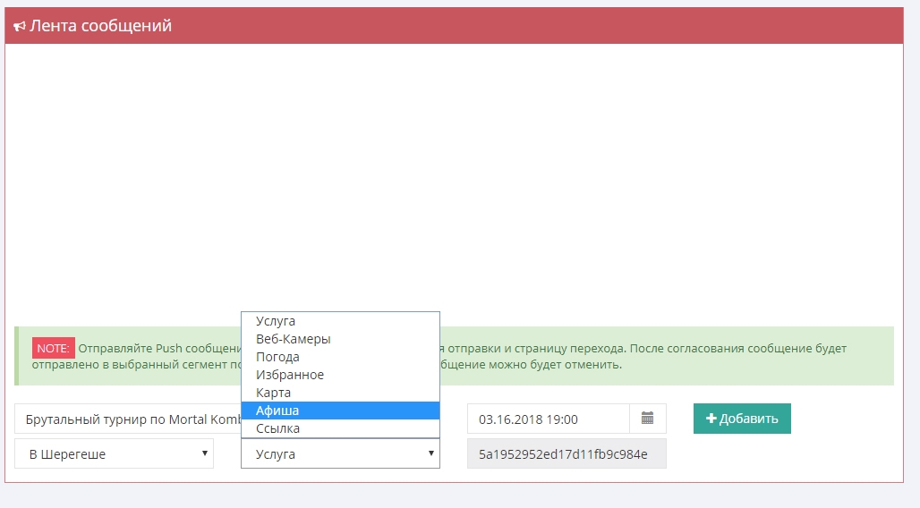 (!) Также модераторы имеют дополнительные настройки для отправки push-уведомлений. Вы можете выбрать любой вариант в выпадающем списке. Например, на объект, услугу или категорию, веб-камеры или карту, афишу, ссылку и т.п. Ниже представлен пример из приложения "Шерегеш Today".